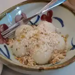 The soft and warm glutinous rice dough, mixed with shredded coconut, crushed peanuts and sugar, is sweet and delicious.