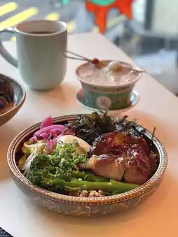 🤍24-hour slow-cooked Iberian barbecued pork with lard rice, Japanese onsen egg, Korean seaweed, pickled red onion and soybean sprouts