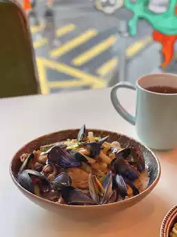 🤍Stir-fried Japanese hormone-free chicken neck, fresh and tender French mini mussels cooked with garlic slices, Japanese Inaniwa Udon stewed with bok choy and sakura shrimp, bonito cream sauce