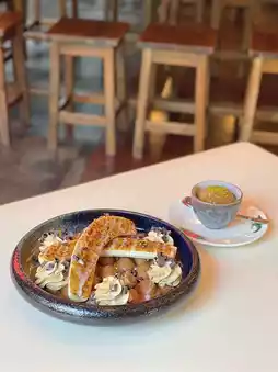 🤍Egg waffles with Chinese rice cake, mascarpone cheese coffee flavored cream, caramel banana, espresso coffee ice cream