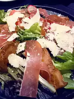 Parma ham topped with roasted honey pears and salad vegetables, refreshing and refreshing.