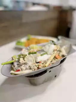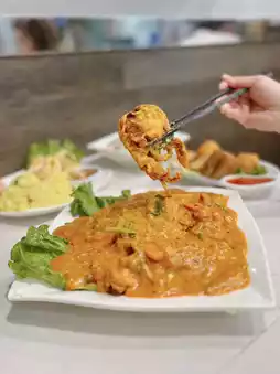 Super large plate of curry very full of more than 10 soft shell crab 🦀️ dipped in curry sauce very tasty coconut flavor enough easy to enter so large portion really 4 5 people share enough