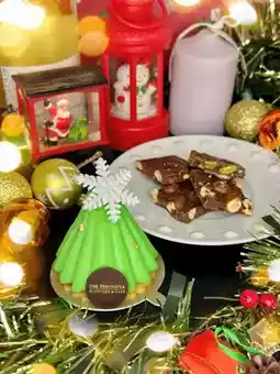 The Christmas tree shape is especially festive, with pistachio mousse with candied cherry and chocolate sponge cake and crispy butter cake base