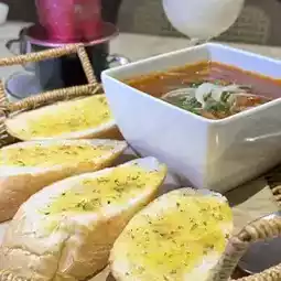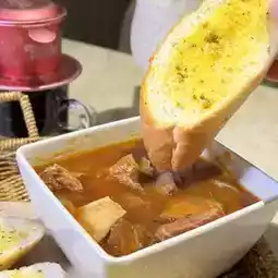 Vietnamese tomato sauce paired with beef brisket, the taste turned out to be sweet and sour, and the beef brisket stewed soft and flavourful, served with crispy ready-to-baked garlic Vietnamese French bread, delicious