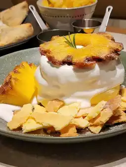 To the main character of the thick soufflé pancake, we chose this pineapple coconut, the pancake paired with 5 hours of low temperature slow roasted caramel pineapple, coconut sauce, butter pastry crumbs, full of subtropical flair. The soufflé is soft and airy, very fragrant with pineapple and coconut. The slow-roasted caramelized pineapple is sweet and sour and delicious.