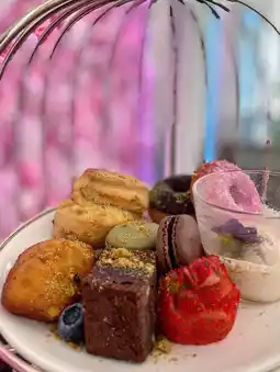 The upper tier is my favorite dessert. Included are Earl Gray custard, macarons, mini donuts, brownies, citrus mussels, and grape muffins.
