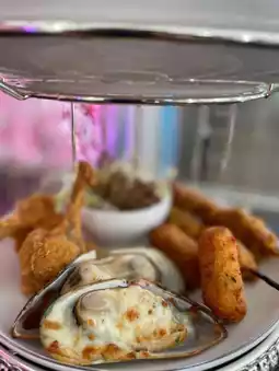 The bottom layer is a hot plate with satay chicken skewers, mozzarella cheese sticks, cheese baked mussels, and garlic chicken nuggets.