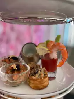 The middle tier has anchovies black caviar smoked salmon tartar, Bloody Mary cocktail shrimp, and crabmeat mushroom pastry box.