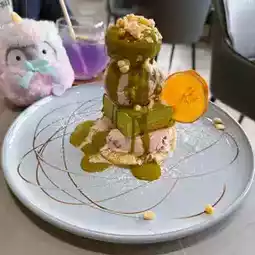 The pancakes have a light, soft crust and a smooth texture, making them incredibly delicious. Uji matcha's rich aroma and unique bittersweet flavor add depth and complexity to the pancakes. 🥞😆🤤 The perfect thickness makes every bite satisfying.