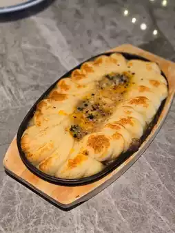 Cheddar seafood pie with mashed potatoes, served on an iron plate. Frankly, it looks poorly, too small of seafood, but the mashed potatoes are very tasty, with a little octopus and mussels, you can try.