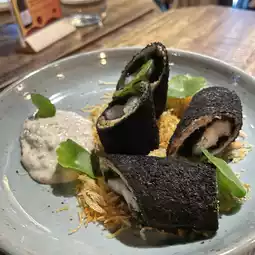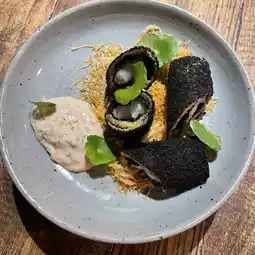 This dish has layers: the first layer is crispy bamboo charcoal, the second layer is thin and crispy bread, the third layer is seaweed, and finally, it wraps around prawn meat, giving it a firm texture. The sauce is a prawn-based salad dressing.