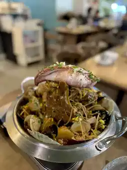 Stewed ribs with seafood, a large pot of rich stew is added with a variety of rich seafood, including scallops, bacon, mussels, mussels and squid🦑, with ribs as the main character. The soup is spicy and rich, with layers of spiciness but not overly spicy, and is infused with the freshness of seafood.