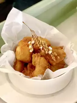 The dessert is a surprise, with a crispy crust and a green tea aroma, and a lot of tasty sesame seeds on the side. With taro paste in the filling, the taste and texture are rich.