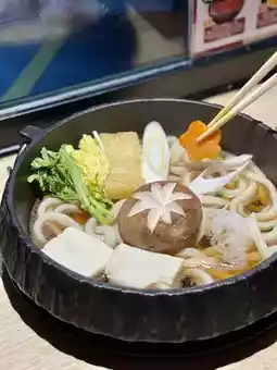 Udon is thick and chewy, and absorbs the essence of the rich soup. It is very delicious and can also be served with Japanese rice.