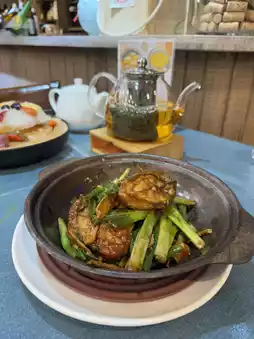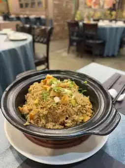 The clay pot rice with abalone and chicken features abalone pieces and tender chicken chunks as the main ingredients, complemented by the crispy rice at the bottom of the clay pot, creating a rich and layered taste.