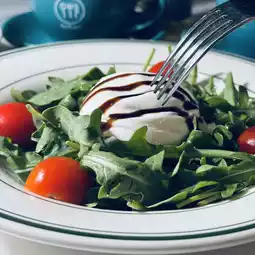 A whole fresh burrata cheese, with fresh rocket and small tomatoes, soul sauce balsamic vinegar, delicious is that simple