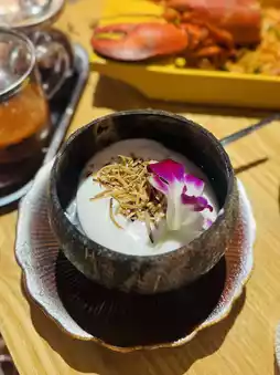 No matter how full a woman is, she has to finish with dessert🫣, so we chose a small one. Usually when I eat Thai food, I usually eat mango glutinous rice for dessert🥭, but I didn't expect this to be quite a surprise😲. There is a little cream (coconut milk?) that looks like milk cover on top, and a jelly with lots of strips of coconut meat underneath🤓. The two work well together, not too sweet or too greasy 👍🏻, we all ate it in the end🤪.