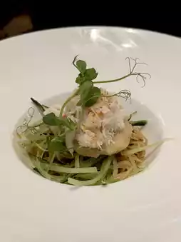 Hokkaido Spicy Squid Liver Sauce and Snow Crab Meat Pasta, with more crab meat than pasta, and crispy cucumber adding layers to the main dish.