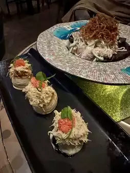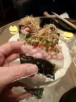 Scallion Toro Three-Color Seaweed Taco Sushi Hand Roll, with crispy seaweed holding fresh minced tuna, scallops, and salmon roe, topped with scallions, is simply amazing.