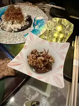 Japanese Tofu, which looks like tamagoyaki at first glance, is actually small tofu pieces topped with grilled sauce and bonito flakes.