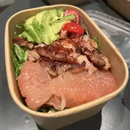 Honestly, the portion size of the salad was surprising, it was huge and the ingredients were plentiful. The chicken was marinated and very flavorful, and they used the tender part of the chicken thigh, which is perfect for salads 👍🏻👍🏻. It was paired with fresh avocado, pomelo, cherry tomatoes, and other fresh vegetables 👍🏻. The pomelo salad dressing was tangy and sweet, very appetizing 🤤.