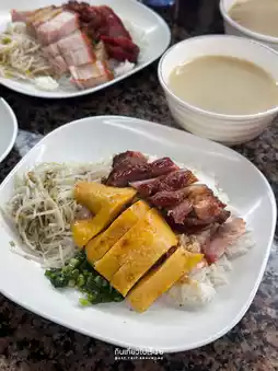 #HongKongTravel #HongKongTravel Review of a chicken rice restaurant with roast pork, crispy pork, and roast duck. This is a restaurant that we passed by without planning on our way to Kwan Tai Temple in Sham Shui Po. The restaurant is like a house on the ground floor of a tall building. The menu has strange English. It's very local. We didn't understand what we ordered until the seller was confused. We ended up ordering rice with two more types of meat for each person. The amount per plate is so much. If we shared it with two people, it probably wouldn't be finished. The price for one dish is $42, but if we had two dishes, it would be $44. It also comes with soup. It's so delicious.