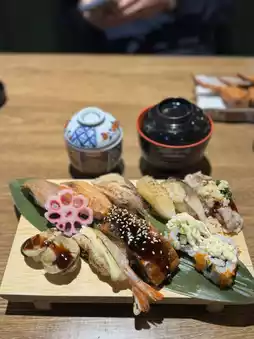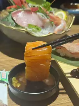Very affordable sushi and sashimi set meal with tea bowl steamed bean curd soup