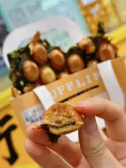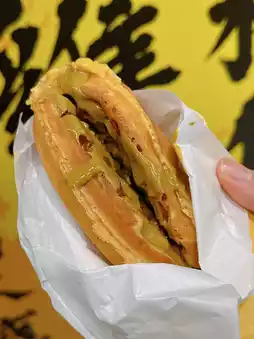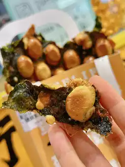 Adding whole piece of seaweed is very crispy. Each waffle is fluffy🥚 The bun has a filling of minced meat. It's full of ingredients😍 The taste is salty and sweet. The heavy egg flavor can't help but eat one after another