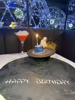 The cake is stunning when served. The staff lights it up, making the plate look like it's surrounded by sparkling fireworks. The blue and white marble chocolate mixed berry cake is sweet and tangy, with a smooth texture. Delicious!