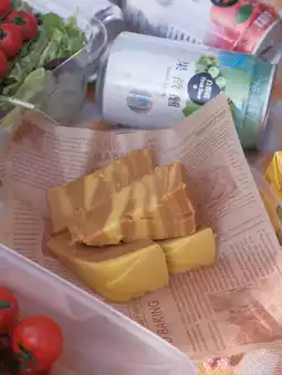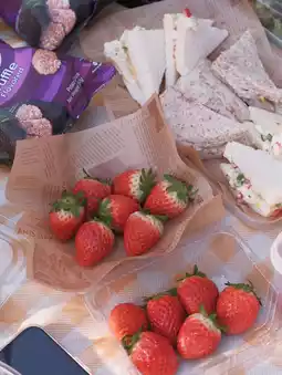 Food: Sandwiches, cakes, salads, snacks, fruits, and drinks