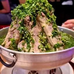 There is a large piece of pork plum meat that is grilled and cut open to share happily