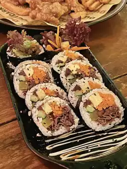 The seaweed rice rolls are rich in ingredients, with roast beef, carrots, pickled carrots, burdock, eggs, lettuce, cucumber, and pickled carrots.