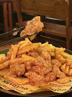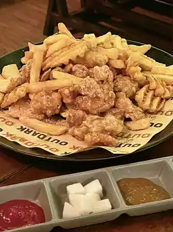 There are plenty of fried chicken portions, crispy on the outside and tender on the inside, the outer layer is covered with honey and garlic sauce, which is very tasty. There are also crispy fried fries and potato grids, which are really rich.