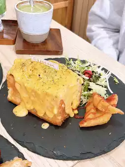 The signature box toast is fried in butter, fluffy and crispy, filled with smooth scrambled eggs, drizzled with cheese and bacon for a rich layer