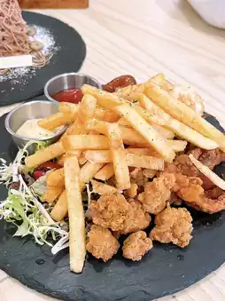 There are five kinds of ready-to-eat fried food platter. French fries sprinkled with seaweed powder, Taiwanese black pepper intestines are smooth, crispy fried chicken cartilage is crispy on the outside and soft on the inside, dumplings are easy to eat in one bite, and fried squid is smooth and fragrant
