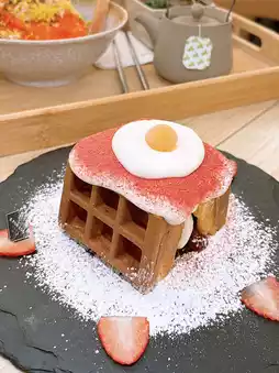 It looks cute, the cute omelet is spread on the waffle, the egg white is cheese milk cover, the egg is Q-bomb pudding, the waffle is very crispy, sandwiched with ice cream glutinous rice, very satisfying