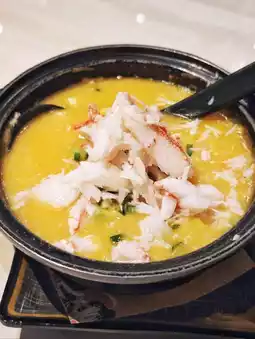 Seaweed, crab powder and crab meat congee 🍲 Hot on the original pot, I then remove the meat from the matsutake crab legs 😋 and mix them in, the crab meat 🦀 is super fresh and sweet!