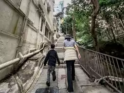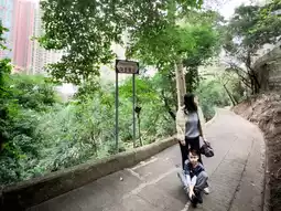 Walk up Old Peak Road, a steep, paved road surrounded by trees and luxury residences.