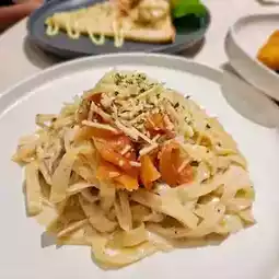 The main course is this [Smoked Salmon Spinach Cream Spaghetti] Smoked salmon with cream sauce, rich and not greasy, spinach adds a little freshness, the overall balance is good
