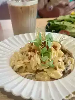For the main course, I ordered the cat ears and salty waffles. The smoky and tough cat ears spaghetti was covered with carbonara sauce. It won my sister's heart and I almost ate it all by myself😋