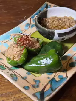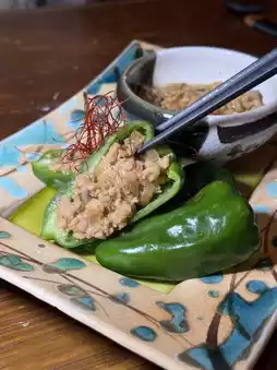 The green pepper is refreshing and sweet, without any bitterness. It is paired with minced pork miso, which tastes spicy and sweet. It tastes great with the green pepper.