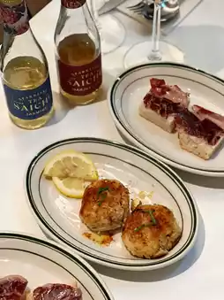 The two homemade crab cakes are golden, crispy and thick. Each bite is filled with sweet crab meat, a little bit of sweet rocket and refreshing lemon.