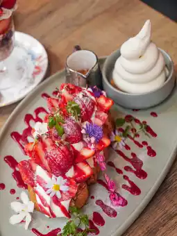 Topped with sweet strawberries, paired with fresh cream & strawberry jam,