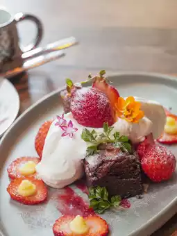 Rich and slightly bitter chocolate brownie x juicy AMAOU strawberries,