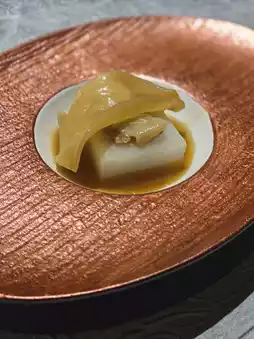 There is always no shortage of soups in the sets designed by Master Jiang, and this time is no exception. Golden soup chrysanthemum prickly ginseng, the soup is rich and fragrant, prickly ginseng taste is always pleasing, sprinkled with a few chrysanthemum petals, emit a unique aroma, a metaphor for the chrysanthemum poem "Remnant Chrysanthemum" written by Jia Tanchun.