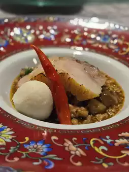 The next dish, tomato catfish quail egg black hair pig, Jiang master Wang Xifeng with tomato catfish and quail egg teasing Liu grandma scene as inspiration, different from the book, is Master Jiang designed tomato catfish, the method is somewhat like we perceive fish-flavored eggplant, accompanied by lightly fried quail eggs and slow-cooked black hair pork belly, too exciting.