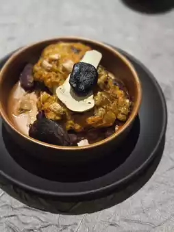 The combination of pine mushrooms, garlic and mussels is a metaphor for the young widowed man who lives a pure and stoic life, loves to be alone and does not care about worldly affairs. The base is served with five-color cloud beans, covered with matsutake mushrooms and garlic, so that the heat is just right and the strips are more layered.