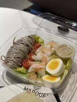 The ingredients are rich, shrimp meat, cherry tomatoes, boiled eggs, salad with sesame sauce, soba noodles are very chewy