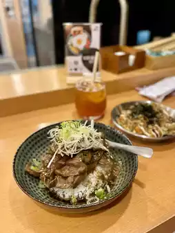 HOT DONBURI Rice bowl representative, sweet sauced beef goes well with rice.