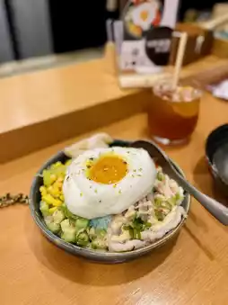 The dishes are exquisitely shaped and served with a variety of sashimi dishes, sesame sauce & tamago.